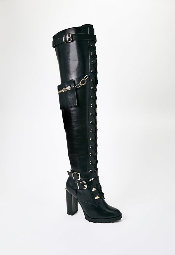 A high boot with a block heel and various buckle/zip embellishments. Material : Faux-Leather Outside Heel Height : 4 Closure : Functional Side Zipper Shaft Height : 22 Imported