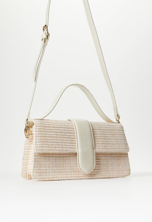 Material : Raffia/Straw Dimensions : 10.24 L x 2.95 W x 5.12 H Strap : 21.06 – 23.45 Pockets : 1 interior pocket, 1 interior zip Drop : 3.54 Hardware : Light Gold Closure : Snap Imported