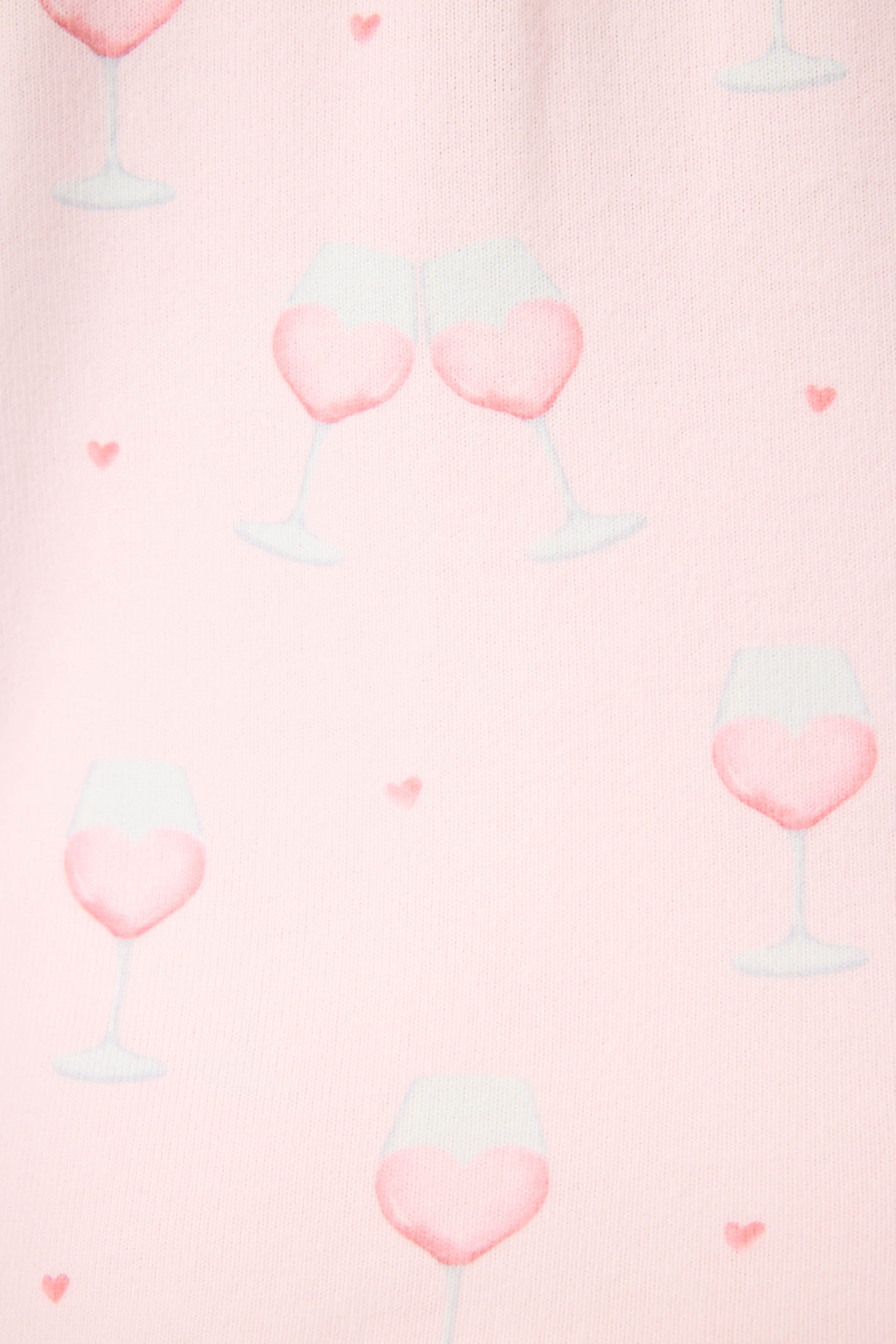 Playful and pretty in light pink. this three-piece pajama set toasts to love. comfort. and cozy nights in. Crafted in ultra-soft butter jersey. it includes a button-down top. drawstring pants. and a matching eye mask embroidered with Happy Hour. Patterned with heart-shaped wine glasses. it’s the perfect set for lounging. unwinding. and sipping something sweet.
