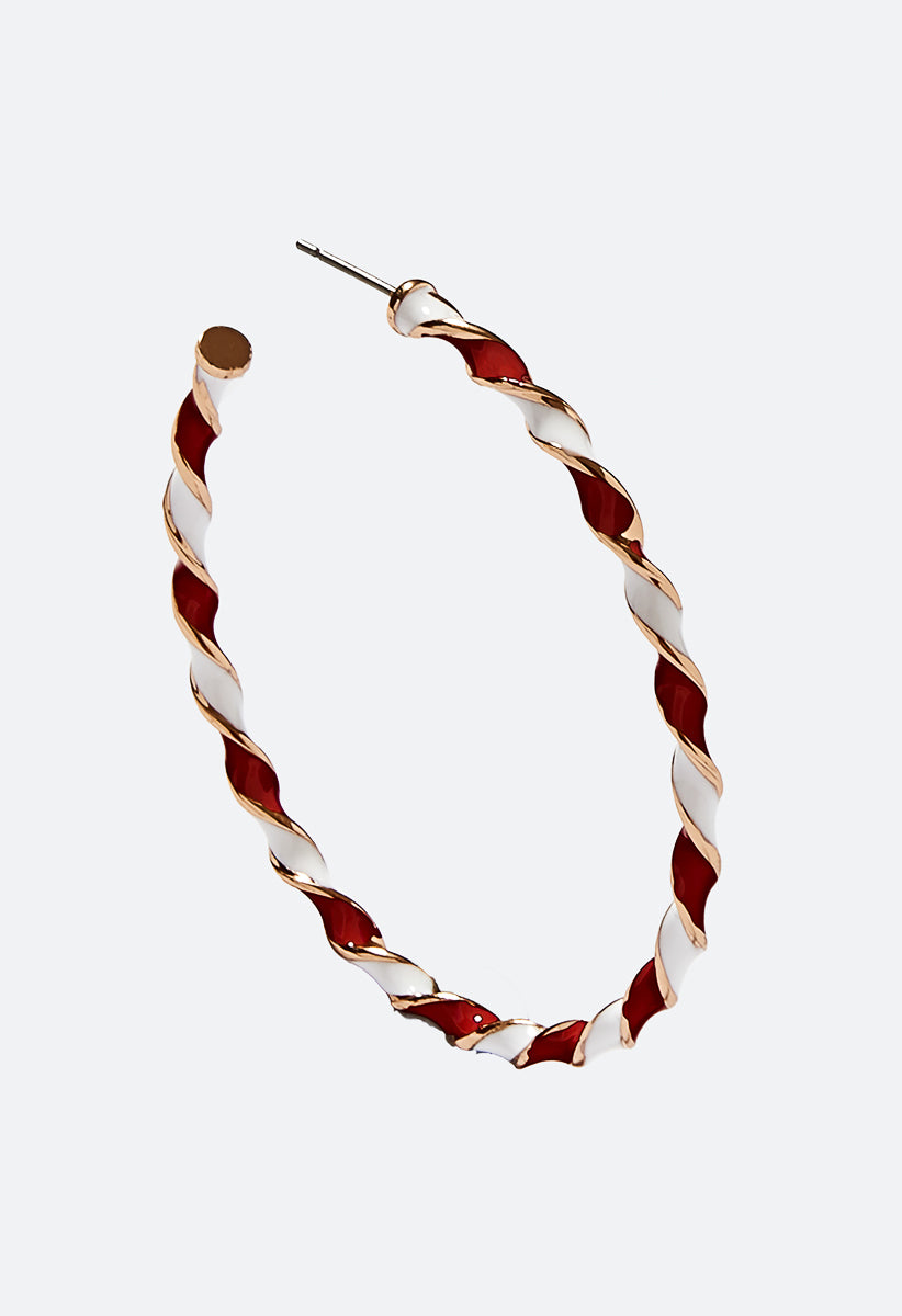 Joy Candy Cane Enamel Hoop Earrings Add Fun For Holiday Season And Gifting Material : 60%zinc 30%epoxy 10%iron Dimensions : Diameter:1.5 Closure : Bullet & Rubber Stoppers Imported