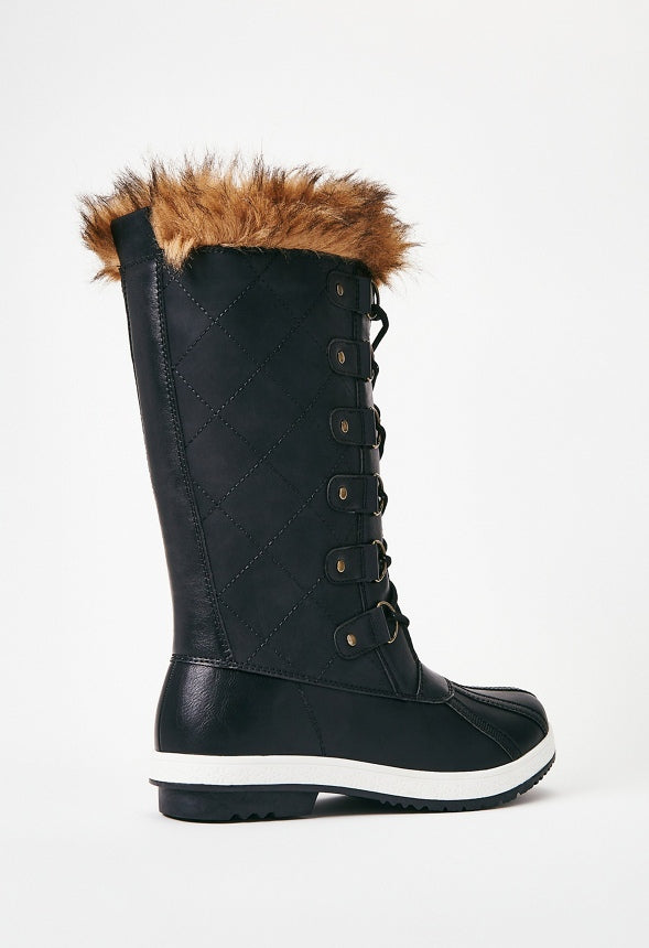 A flat cold weather boot featuring a faux-fur cuff and lace-up closure. Material : Faux-Leather Platform Height : 0.75 Outside Heel Height : 1.5 Closure : Adjustable Laces Shaft Height : 10.75 Imported