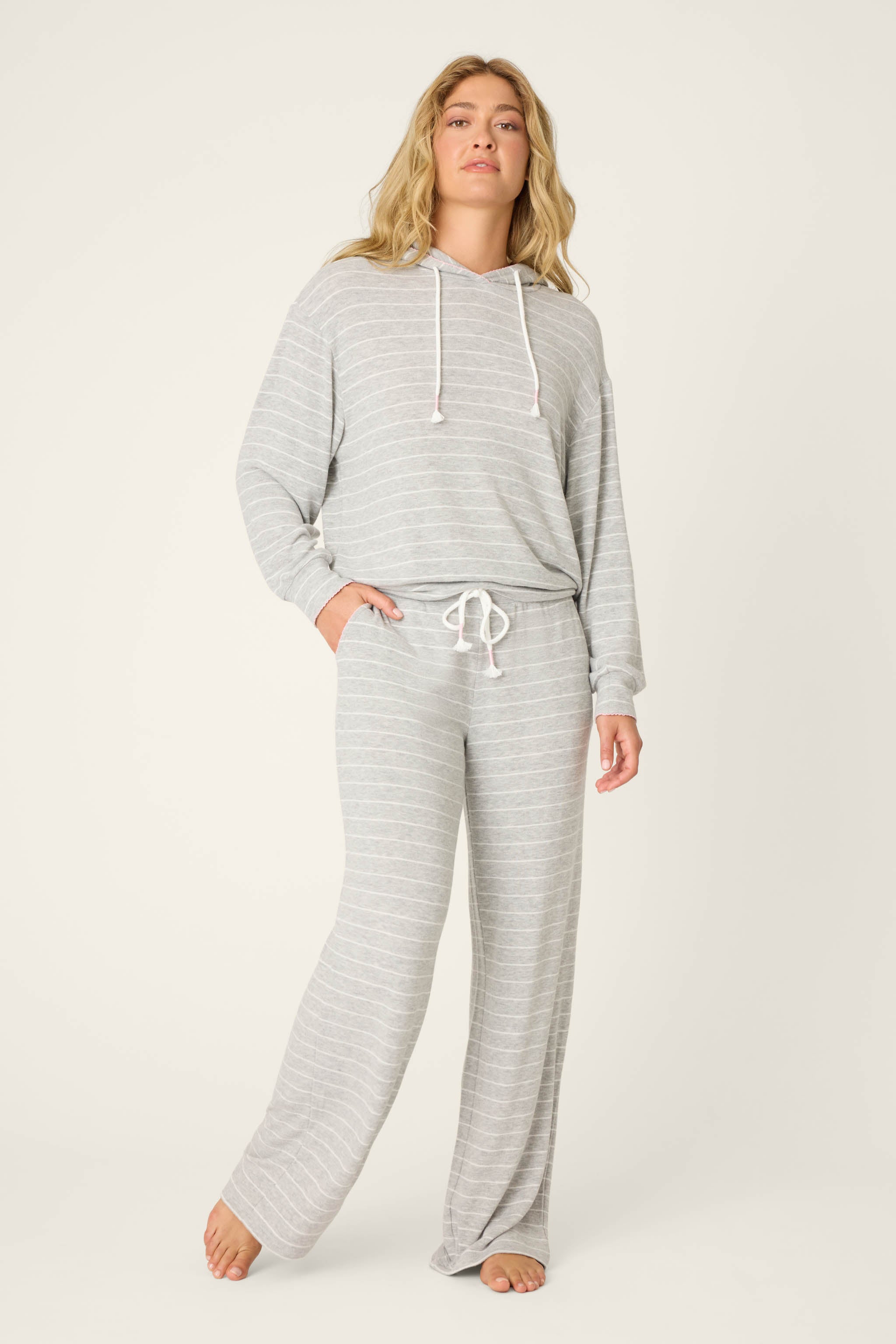 Timeless stripes with a sweet twist. This relaxed hoodie is crafted from our melange peachy jersey for a buttery-soft feel you’ll want to live in. The feminine touches—a pink scalloped trim and tasseled drawstrings—add a playful note to the classic shape. Pair it with the matching pants for a cozy set that’s as pretty as it is comfortable.