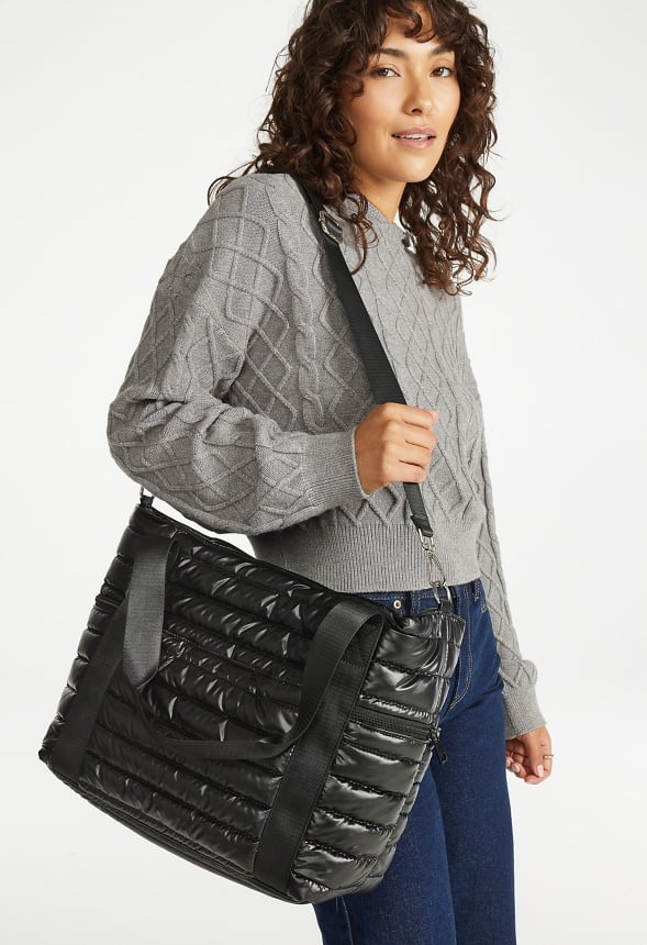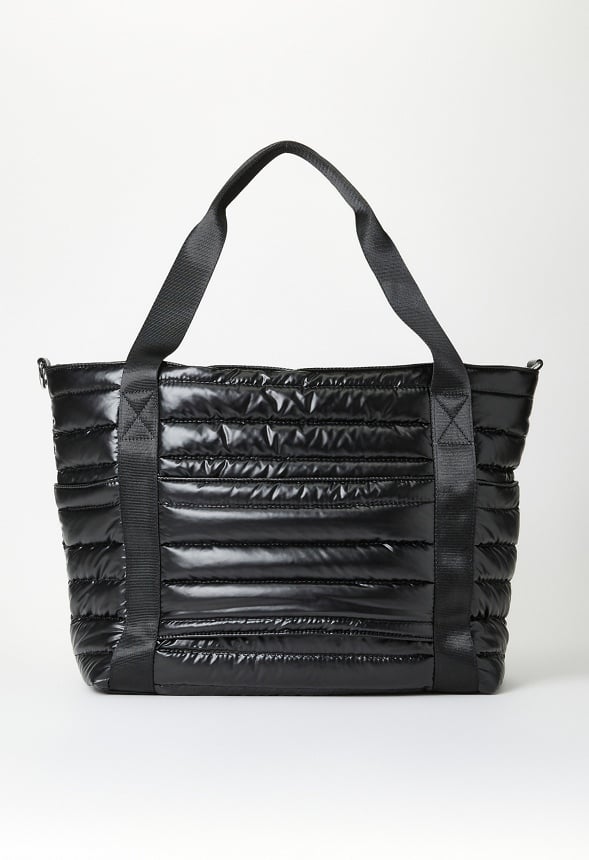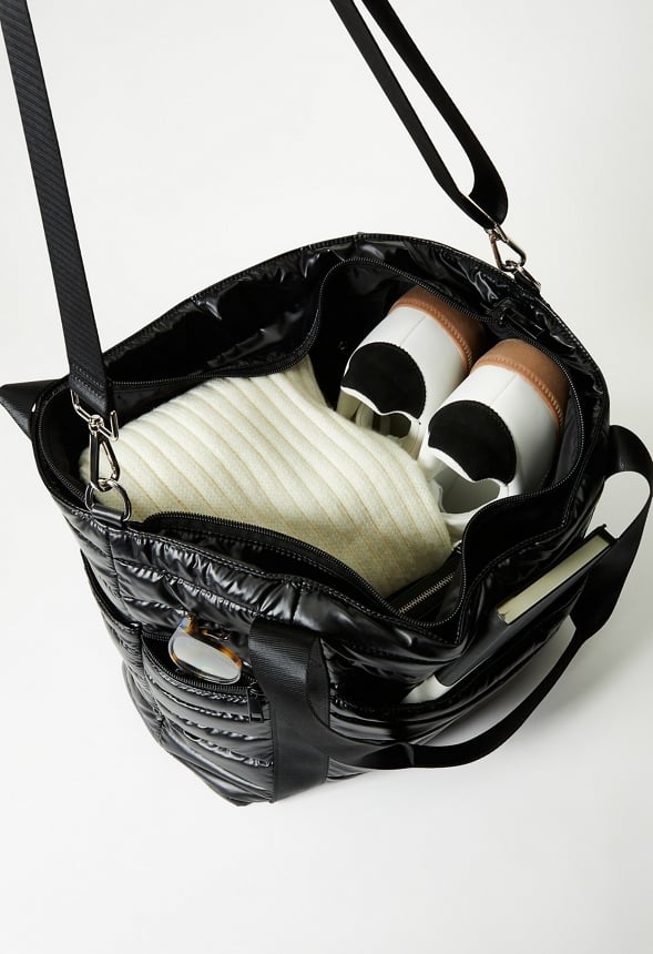 Material : Nylon Dimensions : 14.17 L (Top: 18.9 ) x 6.69 W x 11.02 H Strap : 23.62 Drop : 7.87 Pockets : 1 interior pocket, 1 interior zip, 1 exterior pocket, 1 exterior zip Hardware : Silver Closure : Zipper Imported