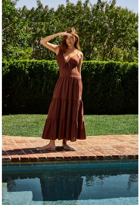 Strap : Adjustable straps Material : 85% Rayon, 15% Linen Length : 49.0 Closure : Front tie closure Care : Machine wash. Please refer to care instruction label inside garment for further details. Imported