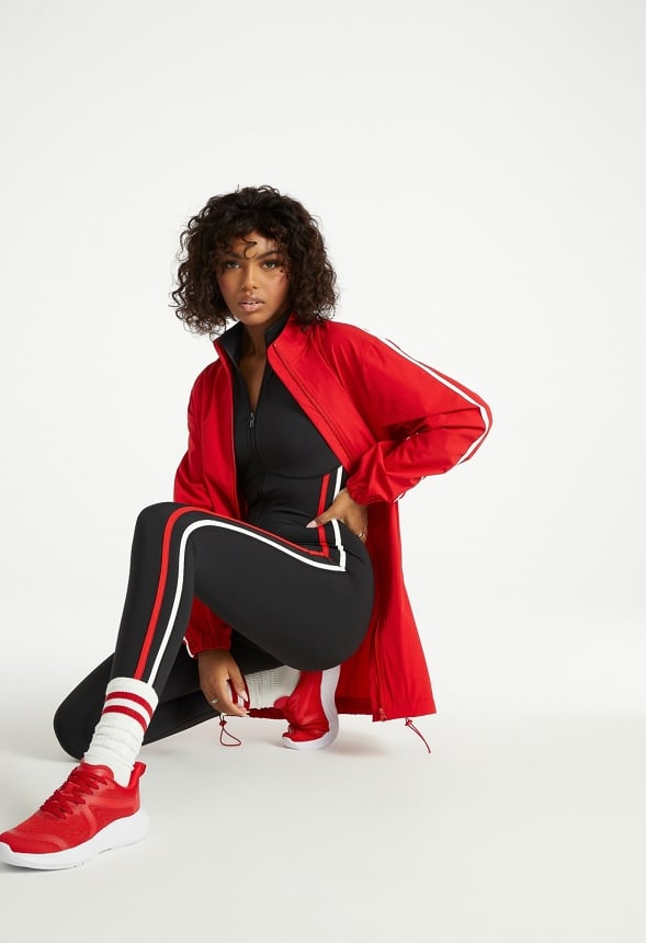 Side stripe detail Zipper front Drawstring hem Material : 92% Nylon, 8% Elastane Length : 34.0 Care : Machine wash. Please refer to care instruction label inside garment for further details. Imported